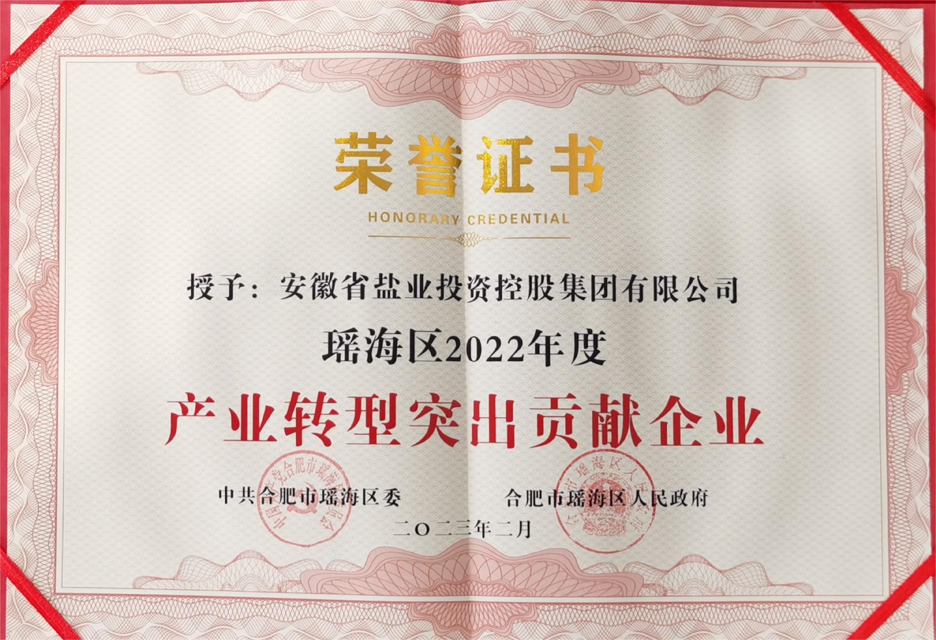 近日,省鹽業(yè)集團(tuán)獲得瑤海區(qū)委、區(qū)政府授予的瑤海區(qū)2022年度“產(chǎn)業(yè)轉(zhuǎn)型突出貢獻(xiàn)企業(yè)”榮譽(yù)稱(chēng)號(hào)。