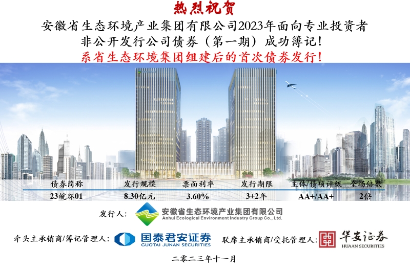 11月24日,省生態(tài)環(huán)境集團首單非公開公司債券(債券簡稱:23皖環(huán)01,債券代碼:253104.SH)在上海證券交易所成功簿記發(fā)行,本次債券由國泰君安、華安證券主承銷,募集金額8.3億元,期限3+2年,票面利率3.60%,圓滿完成集團掛牌以后在資本市場的首次亮相。