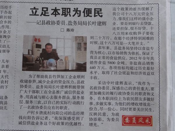 為了幫助我縣竹筍加工企業(yè)順利收儲(chǔ)春筍,減少企業(yè)的資金壓力??h政協(xié)委員、鹽務(wù)局局長(zhǎng)葉建輝積極帶領(lǐng)廣大干部職工在全縣推廣誠(chéng)信供鹽業(yè)務(wù),用真誠(chéng)與耐心去服務(wù)群眾、服務(wù)基層、服務(wù)三農(nóng),以自己的實(shí)際行動(dòng)踐行了一名政協(xié)委員應(yīng)有的職責(zé)。