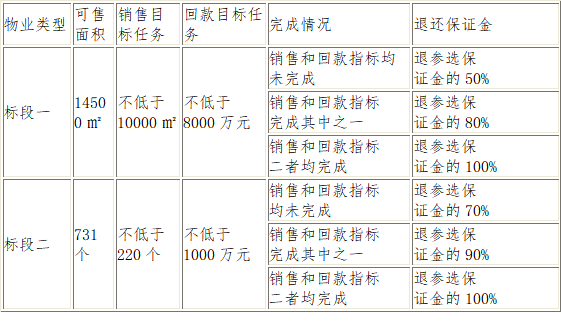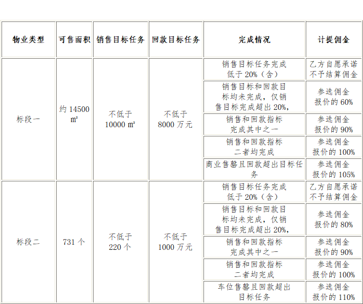 七、投標(biāo)限價(jià):本次比選文件中標(biāo)段一和標(biāo)段二所涉及的業(yè)態(tài)在合作期限、銷售完成目標(biāo)、回款目標(biāo)、分銷團(tuán)隊(duì)人員配備、傭金計(jì)提點(diǎn)數(shù)、以及履約保證金等設(shè)定了最低報(bào)價(jià)指標(biāo),低于此指標(biāo)的按廢標(biāo)處理。