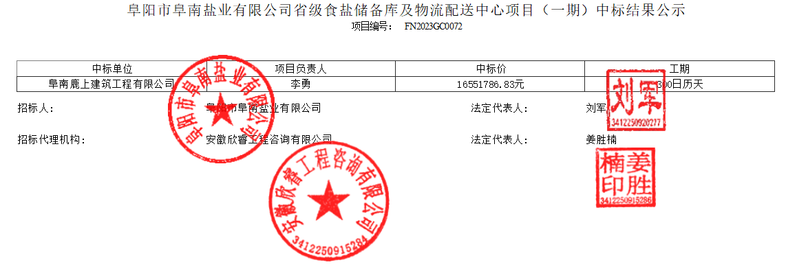 阜陽市阜南鹽業(yè)有限公司省級食鹽儲(chǔ)備庫及物流配送中心項(xiàng)目(一期)中標(biāo)結(jié)果公示