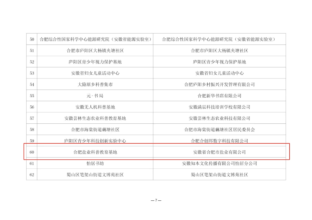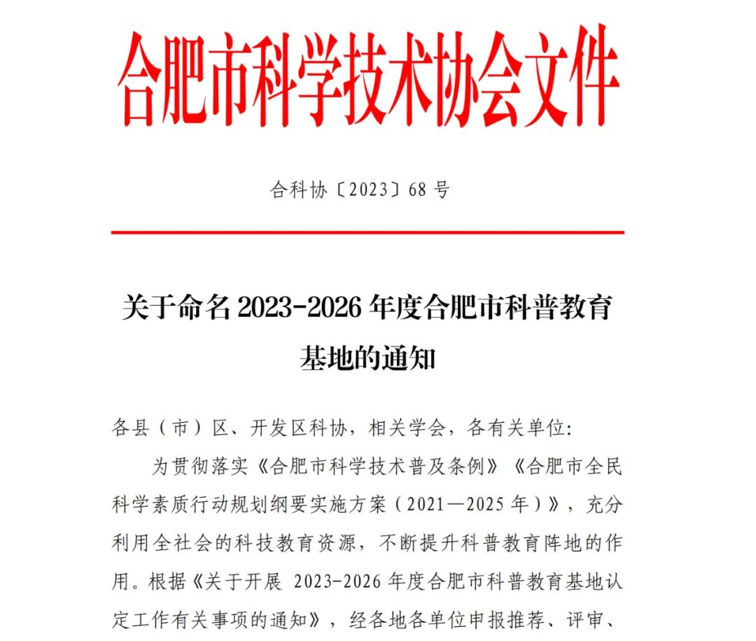 9月21日,合肥市科學(xué)技術(shù)協(xié)會經(jīng)各地各單位申報推薦、評審、驗收、公示等程序,正式發(fā)文公布命名合肥鹽業(yè)等126家場館為“2023-2026年度合肥市科普教育基地”。