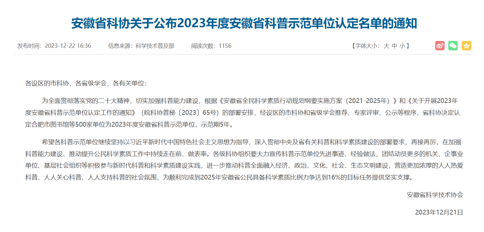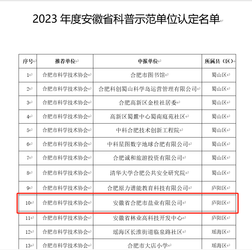 為全面貫徹落實黨的二十大精神,切實加強科普能力建設,根據(jù)《安徽省全民科學素質(zhì)行動規(guī)劃綱要實施方案(2021-2025年)》和《關于開展2023年度安徽省科普示范單位認定工作的通知》(皖科協(xié)普秘〔2023〕65號)的部署安排,經(jīng)設區(qū)的市科協(xié)和省級學會推薦、專家評審、公示等程序,安徽省科協(xié)決定認定安徽省合肥市鹽業(yè)有限公司為2023年度安徽省科普示范單位,示范期5年。
