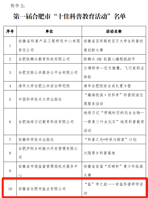 近日,由合肥市科普產(chǎn)業(yè)聯(lián)盟舉辦的第一屆合肥市“十佳展品”“十佳科普教育活動”“科普產(chǎn)業(yè)領(lǐng)軍人物”評選結(jié)果公布,合肥鹽業(yè)“鹽”學(xué)之旅——食鹽科普研學(xué)活動榮膺第一屆合肥市“十佳科普教育活動”。