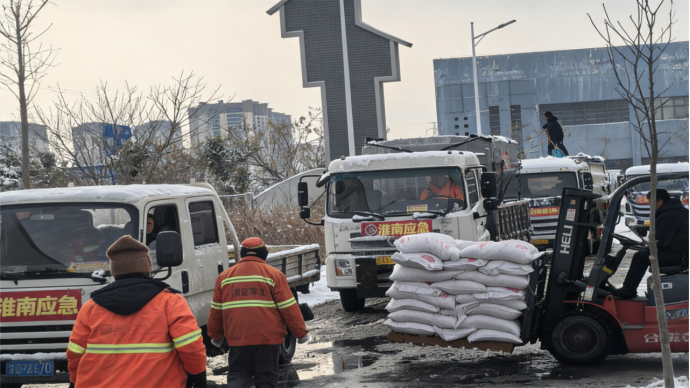 淮南市鹽業(yè)公司與應(yīng)急保障人員協(xié)同作業(yè),搶運(yùn)融雪鹽▲