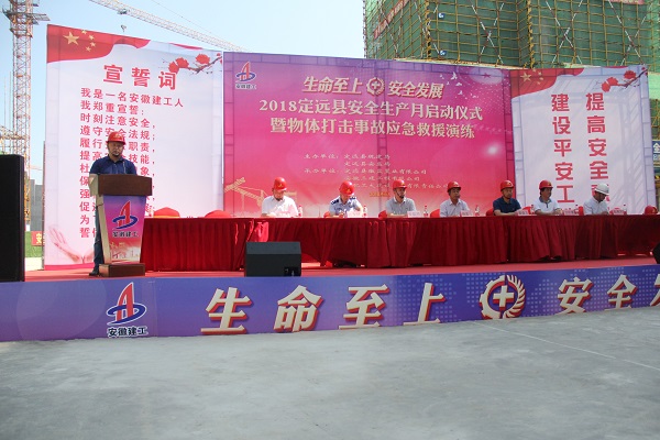 6月12日,定遠縣在徽鹽曲陽現(xiàn)代城開展了以“生命至上,安全發(fā)展”為主題的2018年安全生產(chǎn)月啟動儀式暨物體打擊事故應(yīng)急救援演練活動??h直相關(guān)職能單位規(guī)建局、安監(jiān)局、公安局、衛(wèi)計委等負責(zé)人、徽鹽地產(chǎn)副總經(jīng)理黎元忠、徽鹽地產(chǎn)定遠項目相關(guān)人員等出席了活動。